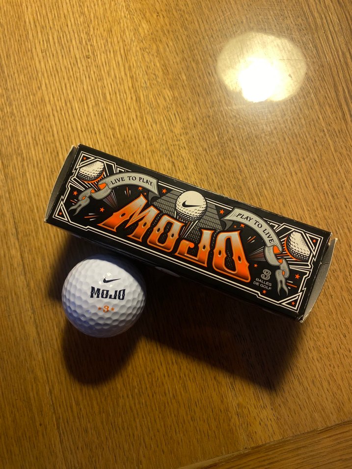 Nike Mojo golf topu beyaz renkte ve üzerinde logo bulunur. Siyah kutusu turuncu ve beyaz canlı grafiklere sahiptir. ⛳️