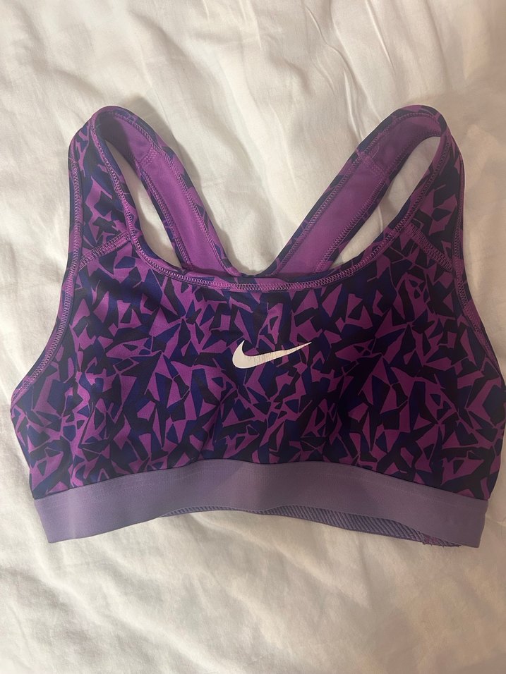 Koyu mor baskılı spor sütyeni, rahat ve destekleyici bantlı. Racerback tasarımlı, önünde Nike logosu bulunur. ️♀️