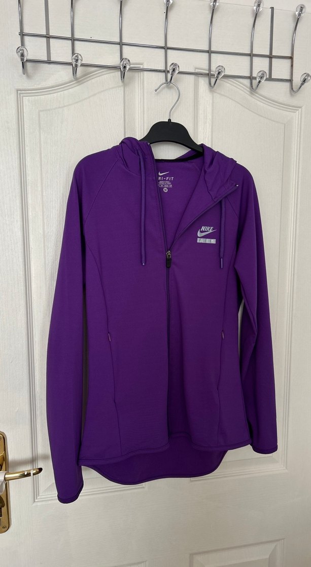 Nike markalı, mor renkli, uzun kollu ve fitted kesimli kadın spor ceketi. Fermuarlı ve yuvarlak yaka, yumuşak fleece kumaştan üretilmiştir.