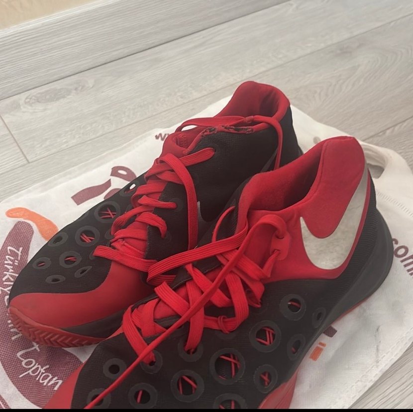 Koyu kırmızı ve siyah renkte, baskılı desenli ve elastik yapılı basketbol ayakkabısı. Spor ve sokak giyimine uygun, kauçuk tabanlı. Sadece bağcık kısmında ufak bir defosu vardır onun dışında ürün sağlamdır