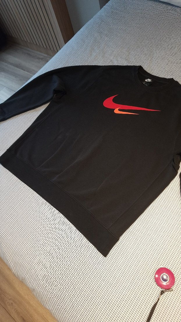 Siyah renkte, baskılı kırmızı Nike logosu bulunan, yuvarlak yakalı ve uzun kollu erkek sweatshirtü. İpeksi kumaştan, bol kesimle rahat ve şık bir görünüm sunar. Günlük kullanım için uygun, zahmetsiz şıklık sağlar. Hafif renk solması var.