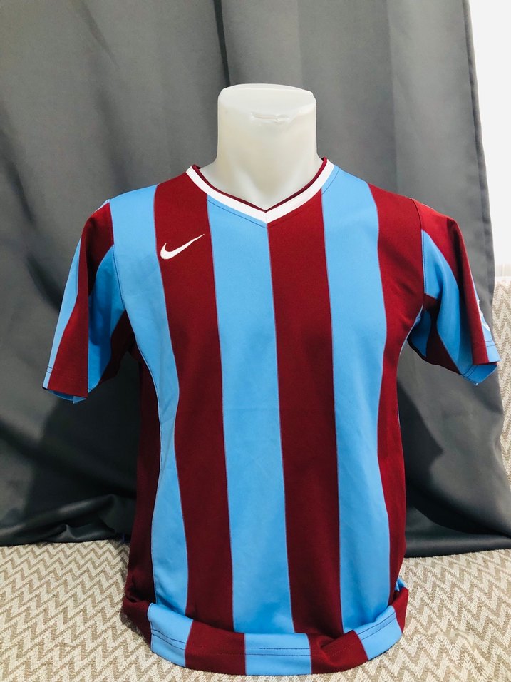 V yakalı ve kısa kollu erkek forması, örme sentetik kumaştan. Bordo ve mavi çizgili, normal kesim, günlük şık kullanım için uygundur.