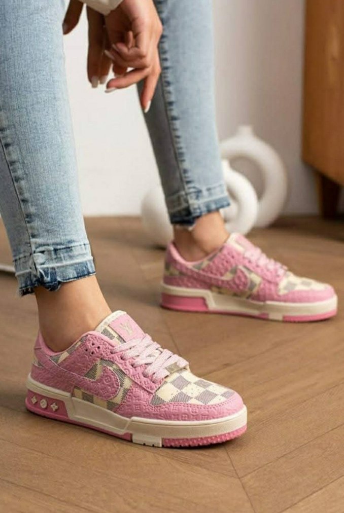 Pembe denim kumaştan, bağcıklı ve blok topuklu spor ayakkabı. Pastel tonlarda tie-dye desenli, günlük kullanım için uygun.