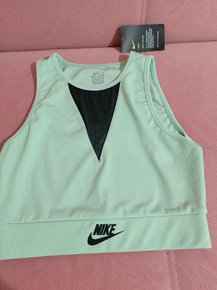Nike marka, pastel yeşil renkli, siyah üçgen baskılı mini spor sütyeni. Athleisure tarzına uygun rahat kesim.