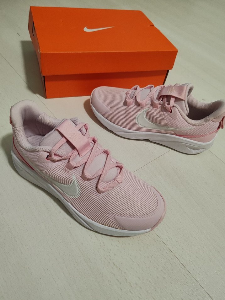 Nike pembe elastik bağcıklı, blok topuklu spor ayakkabı. Kauçuk tabanlı ve desenli, sportif sokak stili için uygundur.