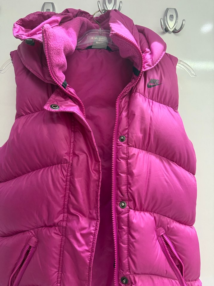 Orijinal Nike pembe yelek, yumuşak ve sıcak kumaştan. Parlak görünümlü, fermuarlı ceplerle, rahat sokak stili için uygun.