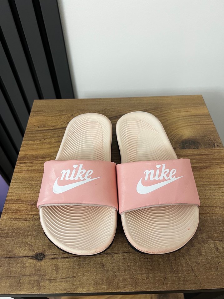 Nike pembe kız terlik, sade ve desensiz tasarımı ile rahat kauçuk tabana sahip, günlük sokak stili için uygun.