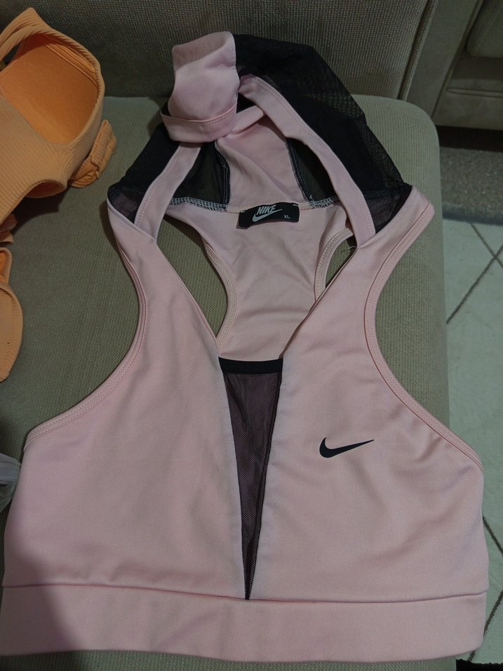 Nike markalı, pastel pembe tonunda, nefes alabilir file detaylı mini sporcu sütyeni. Streetwear tarzına uygun.