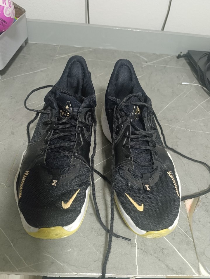 46 Numara. Siyah bağcıklı basketbol ayakkabısı, kauçuk tabanlı, sokak stili ve spor için uygun, koyu renk ve sade tasarımlı, altın detaylı. Ayakkabıların ön koşelerinde hafif açılma ve üstteki dikişinde yırtık var onun dışında sağlam hiç dışarıda giyilmedi