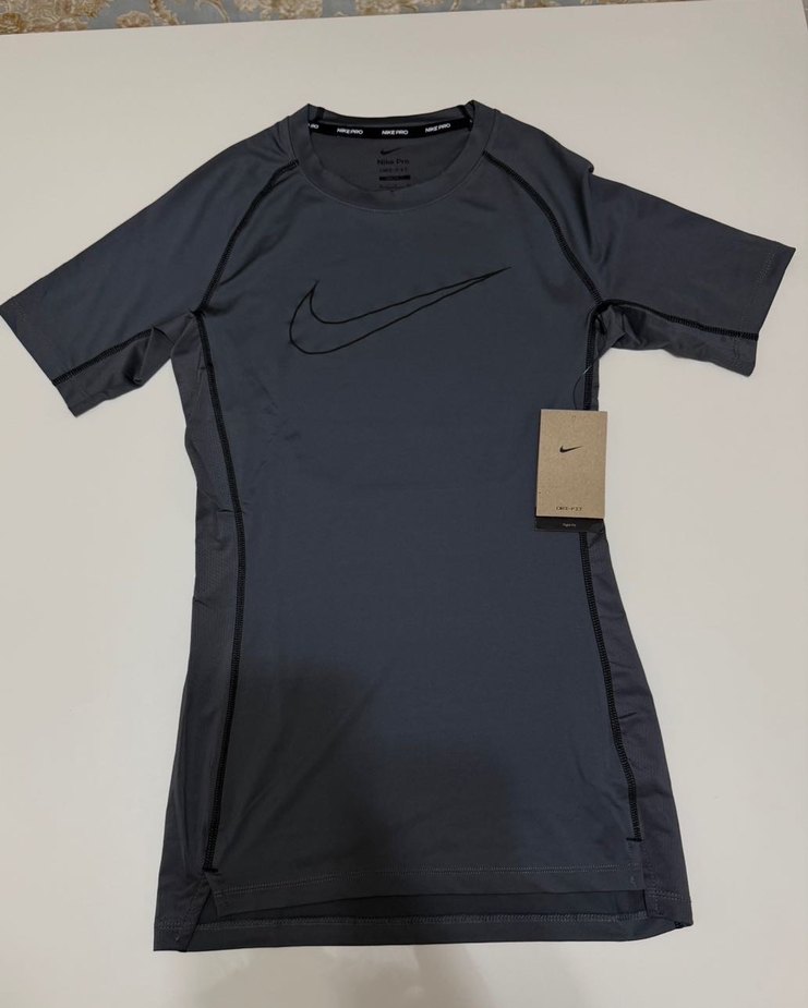 Nike siyah, sentetik kumaştan erkek kısa kollu, fitted kesim tişört. Baskılı logo ve yuvarlak yaka ile spor şıklık sunar. Sıfır orjinal etiketli S beden ♂️