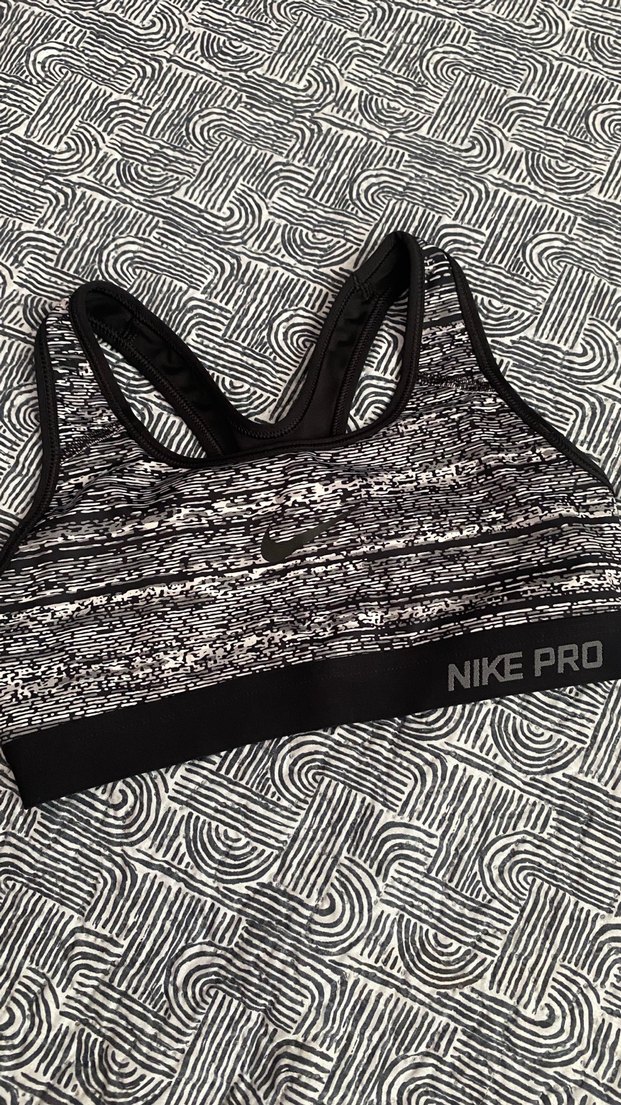 Nike Pro baskılı, koyu tonlarda spor sütyeni. Rahat kesim ve sırt kısmı yarışçı model, destek için "NIKE PRO" yazılı elastik bant içerir. ️♀️