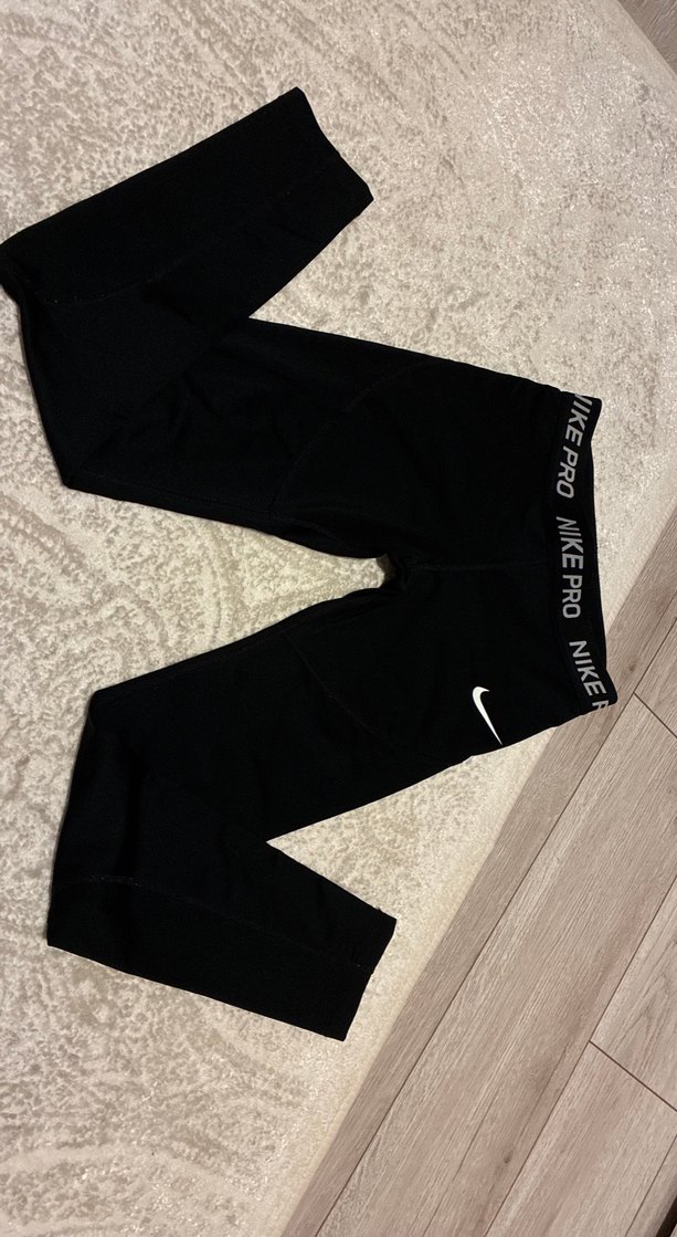 Nike Pro siyah tayt, elastik bel bandı ve baskılı logo ile spor ve günlük kullanım için uygun, midi boy ve dar kesim.