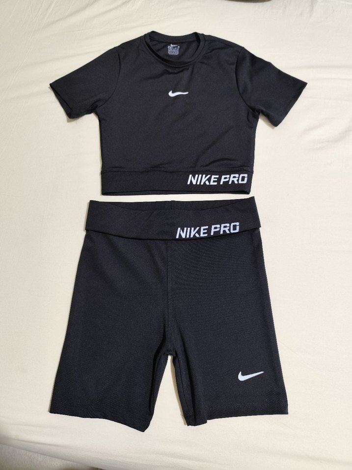 Nike Pro marka, siyah renkli, kısa kollu, dar kesim üst ve şort seti. Düz, desen içermeyen tasarımda, sentetik kumaş kullanılmıştır. Rahat ve şık sokak stili için uygundur.
