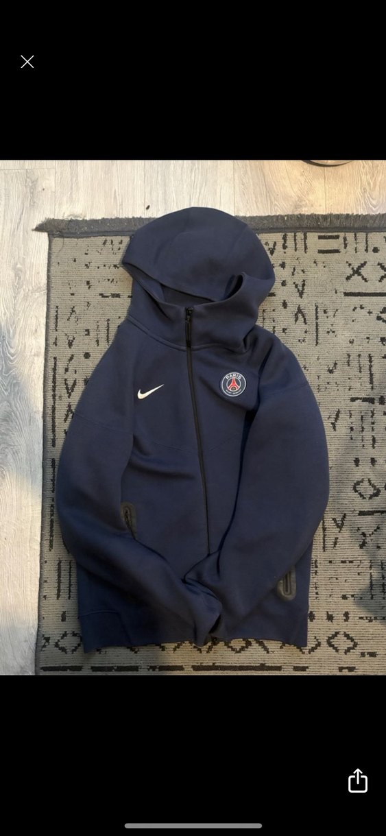 Nike'nin kapüşonlu ve fermuarlı, yumuşak kumaştan yapılmış, koyu mavi renkli ve baskılı PSG ile Nike logolu dar kesim sweatshirtü. Günlük kullanıma uygun. orjinal