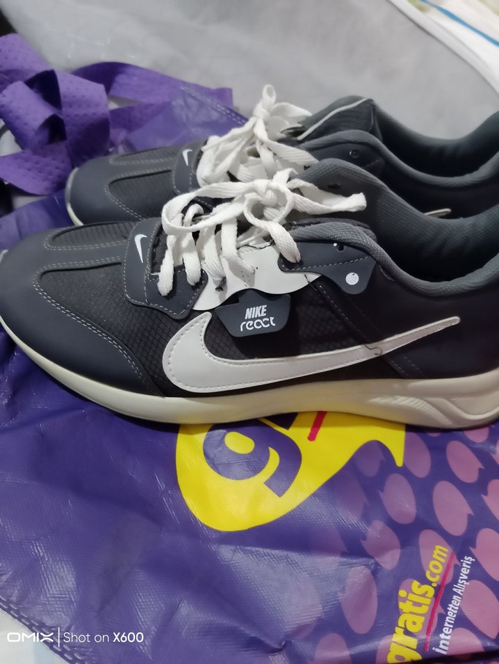 Nike React gri erkek spor ayakkabısı, kauçuk tabanlı ve baskılı detaylara sahip. Bağcıklı tasarımıyla sportif sokak stili için uygun. ‍♂️