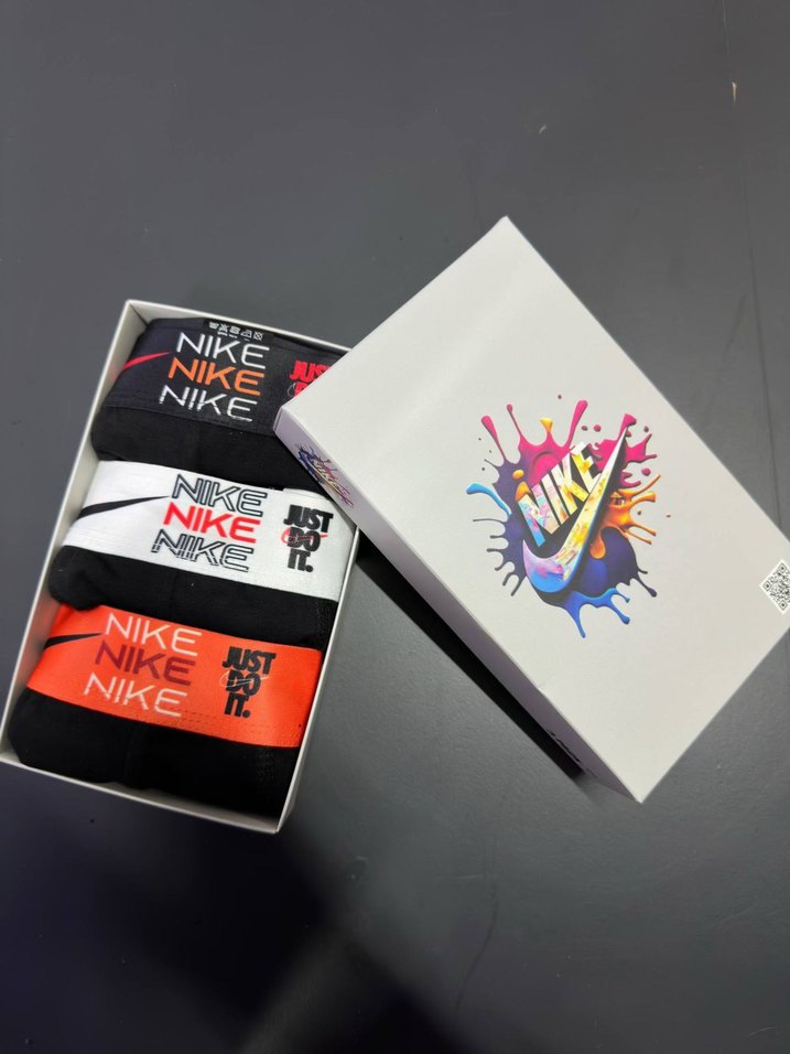 Nike markalı, renkli desenli, kısa ve vücuda oturan erkek boxer seti. Farklı canlı renkler ve desenler içerir.