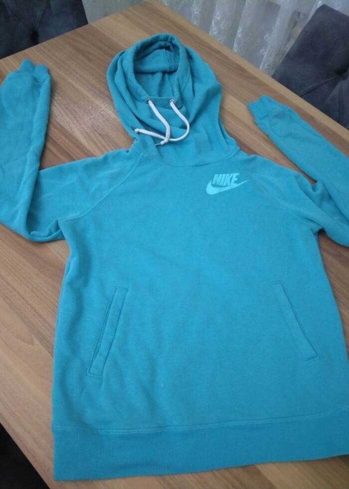 Nike kapüşonlu orjinal.gorselde göründüğü gibi.sorunsuz.turkuaz rengi.S beden.m bedene rahat olur.