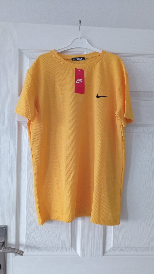 Nike sarı erkek tişört, kısa kollu ve yuvarlak yaka, rahat kesim ve yumuşak sentetik kumaştan üretilmiştir. Günlük kullanım için uygun, şık ve rahat bir tasarım.