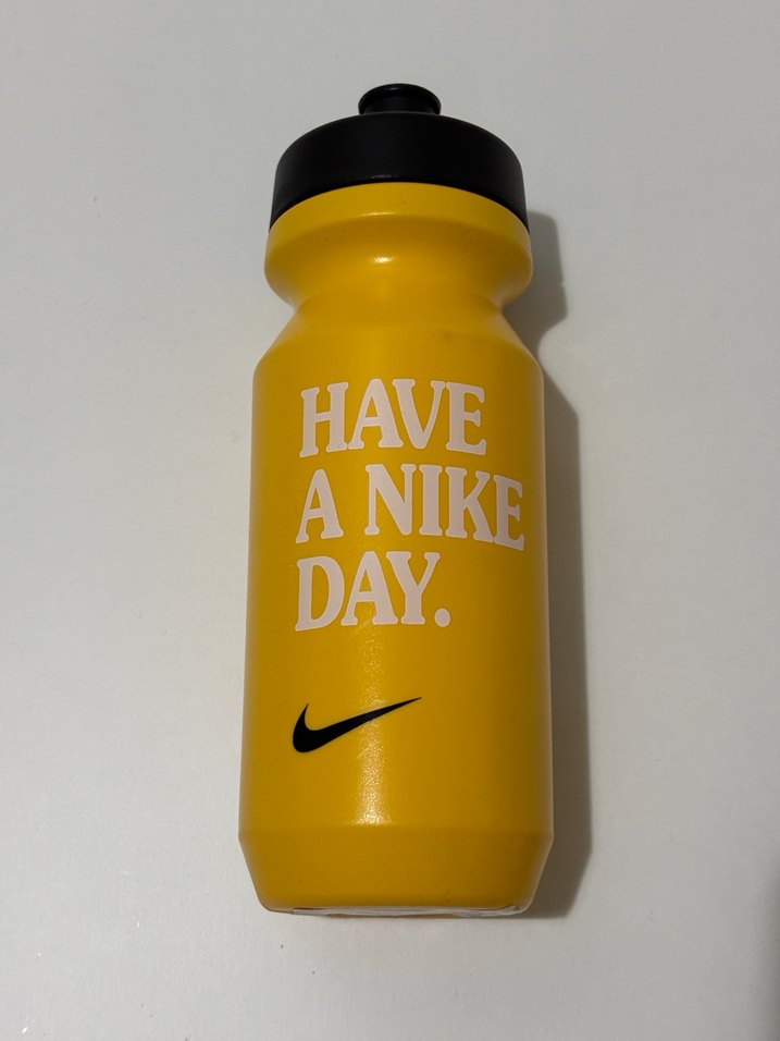 Sarı renkte, üzerinde 'HAVE A NIKE DAY.' yazısı bulunan Nike suluk, siyah kapaklı ve kullanımı kolay tasarıma sahiptir.