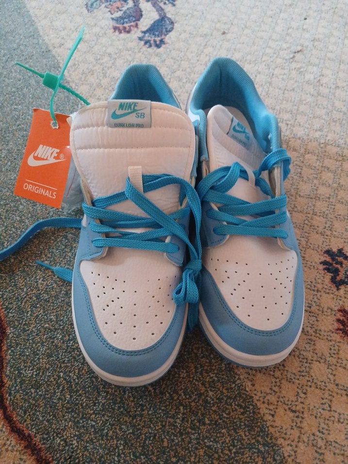 Nike SB unisex spor ayakkabısı, pastel mavi ve beyaz renkte, dolgu topuklu ve bağcıklı, kauçuk malzemeden üretilmiştir. Spor ve günlük rahat stil için uygundur.
