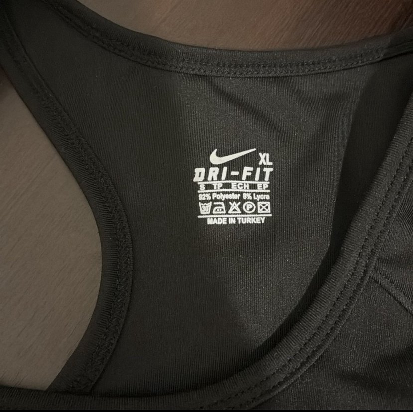 Nike marka, siyah baskılı spor sütyeni. Polyester ve likra karışımı, Dri-FIT teknolojili yumuşak kumaştan üretilmiştir. Athleisure ve street wear tarzına uygundur.
