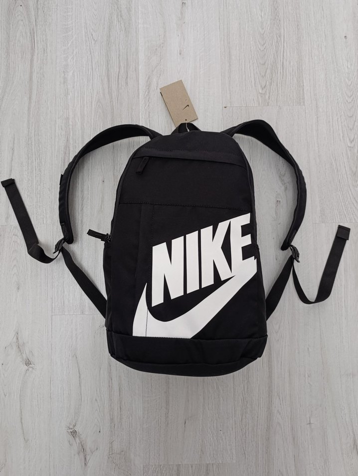 orjinal unisex Nike siyah sırt çantası, büyük baskılı logo ve tokalı askılarla sokak stilini pratik tasarımla birleştirir.