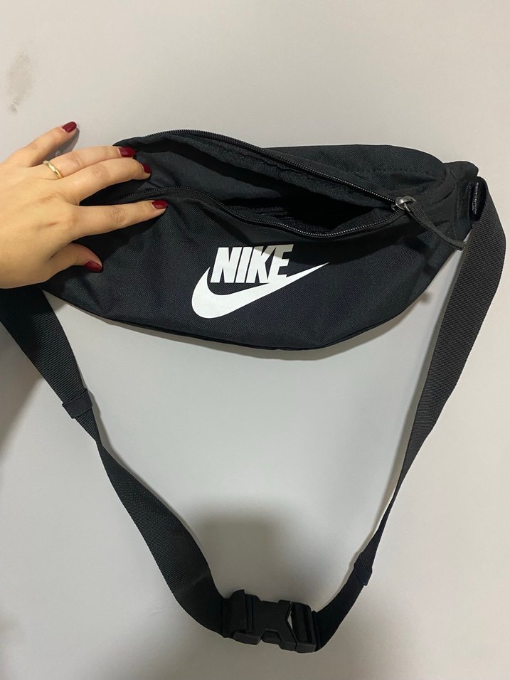 Nike marka siyah bel çantası, baskılı logo ve ayarlanabilir kemerli askıya sahiptir, trend sokak stili için uygundur.