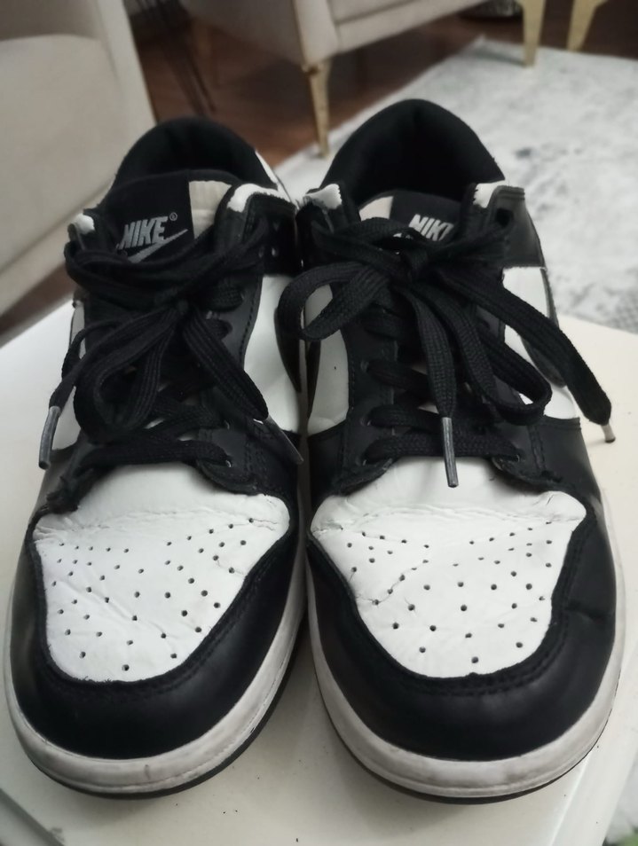 Nike marka, siyah beyaz renklerde, bağcıklı ve tabanı düz kauçuk spor ayakkabıdır. Spor ve günlük sokak stiline uygundur.