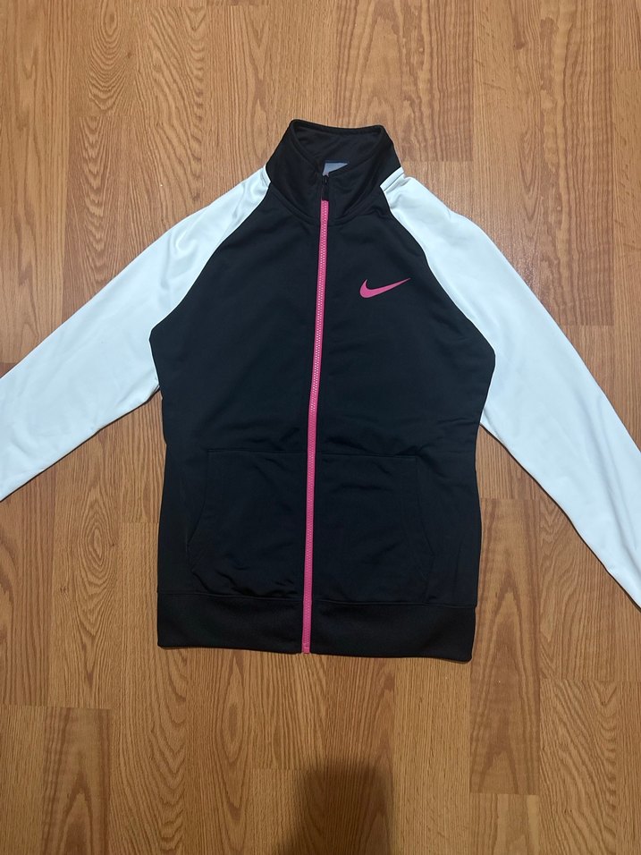 Nike markalı, uzun beyaz kollu, yüksek yakalı ve pembe fermuarlı siyah spor ceket. Yumuşak ve sıcak kumaştan yapılmıştır.