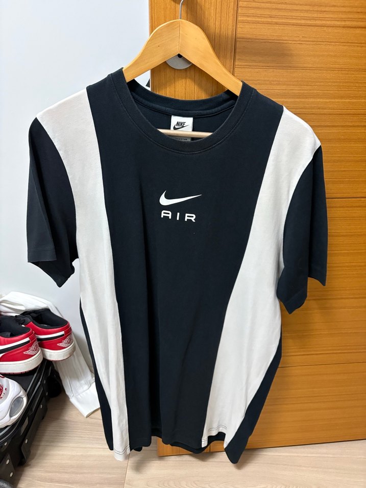 Nike markalı, pamuklu kumaştan üretilmiş, yuvarlak yaka ve kısa kollu erkek tişörtü. Siyah zemin üzerinde beyaz yan paneller ve göğüste baskılı Nike Air logosu bulunur. Rahat kesimlidir.