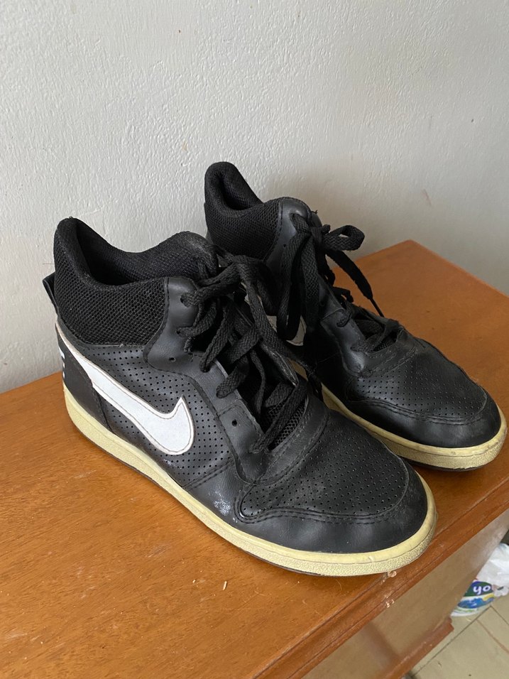 Siyah bağcıklı, dolgu topuklu spor ayakkabı. Kauçuk tabanlı, rahat ve şık sokak stili için uygun. Temiz kullanılmıştır deformesi yoktur fotoğrafta görüldüğü gibidir