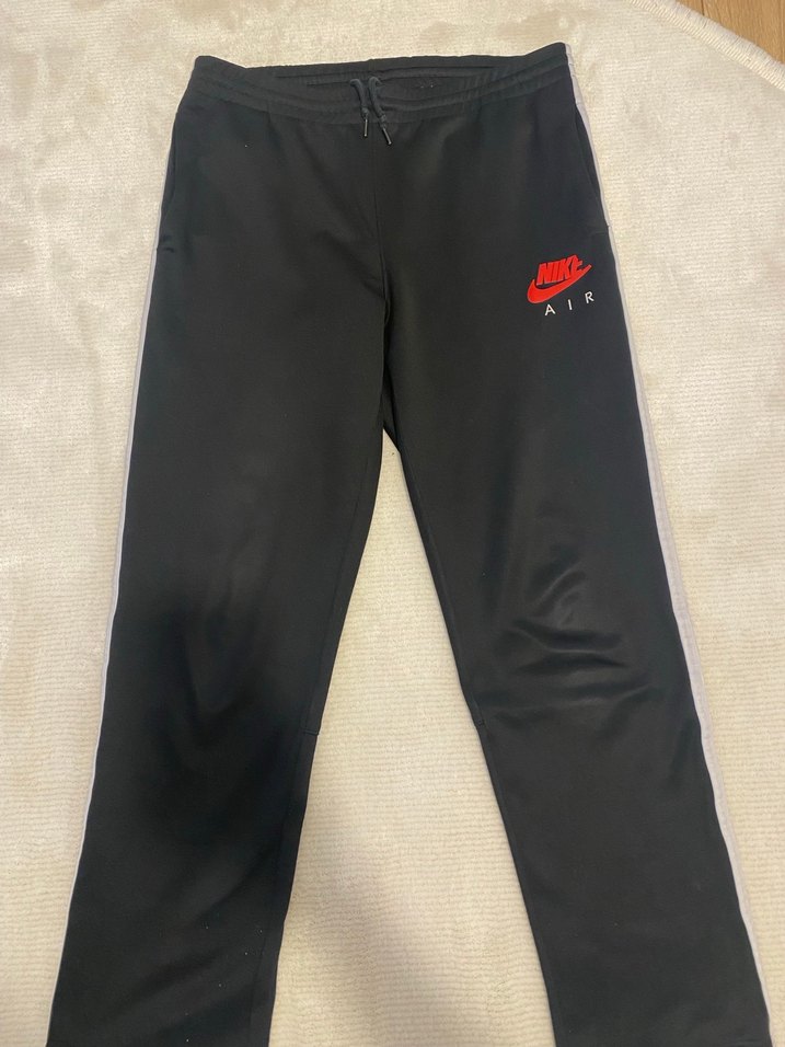 Siyah, bol kesim erkek çocuk eşofman altı, fermuarlı cepler ve kırmızı Nike Air logosu ile sentetik kumaştan yapılmıştır.