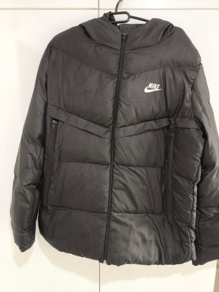 Nike marka, siyah renkte, sentetik kumaştan, uzun kollu ve yüksek yakalı, fermuarlı cep detaylı, spor ve günlük kullanıma uygun erkek midi kışlık mont.