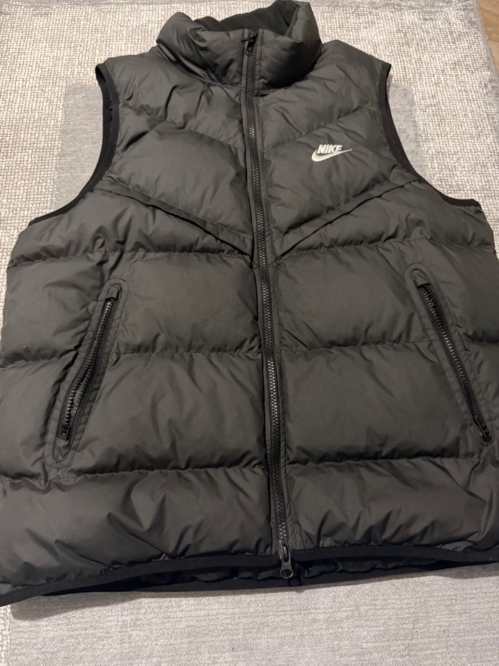 Nike marka siyah renkte, kapitone şişme yelek. Yüksek yakalı, fermuarlı cepli ve fleece kumaşlıdır. Günlük kullanıma uygun, modern kesim.