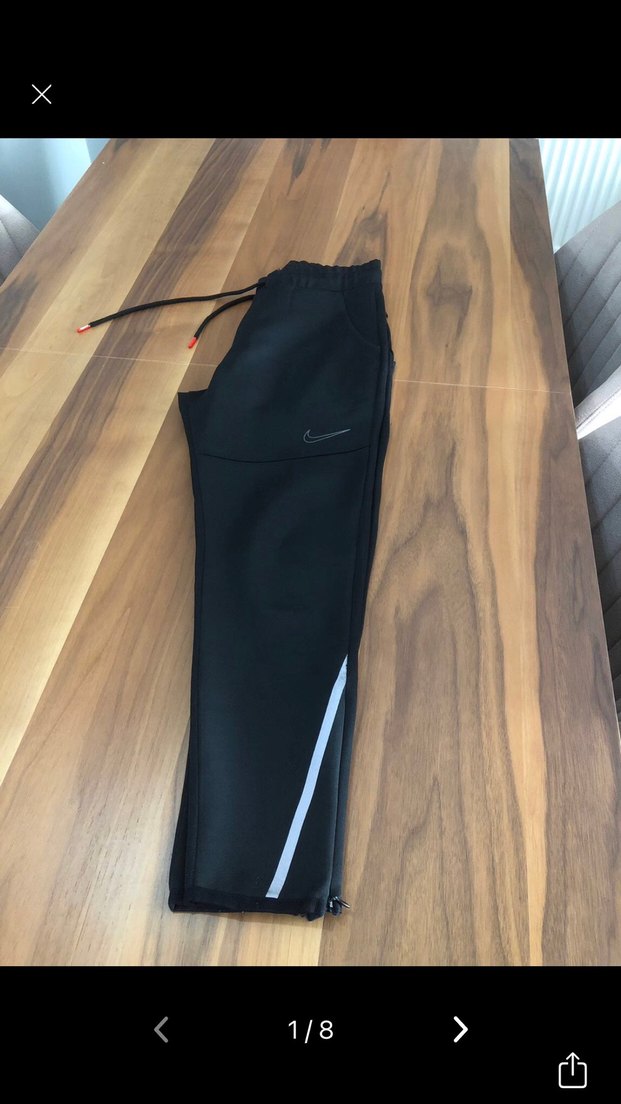 Nike marka, sentetik kumaştan yapılmış, rahat kesim ve midi boyda, yırtmaç detaylı siyah erkek eşofman altı. Spor ve günlük kullanıma uygun.
