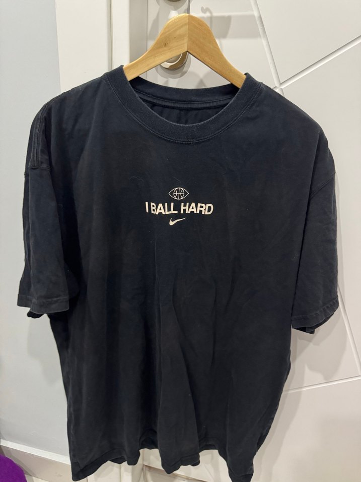Siyah renk, kısa kollu, yuvarlak yaka ve bol kesimli erkek tişörtü. İpeksi dokuda, üzerinde "IBALLHARD" baskısı bulunur, sportif ve rahat stil için uygun.