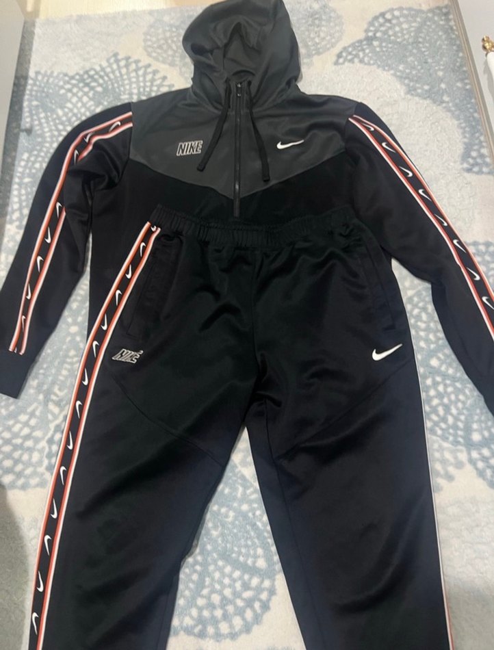 Nike siyah eşofman takımı, yüksek yakalı ve uzun kollu, fermuarlı detaylara sahip, koyu renk sentetik kumaftan üretilmiştir. Dış mekan için uygundur.