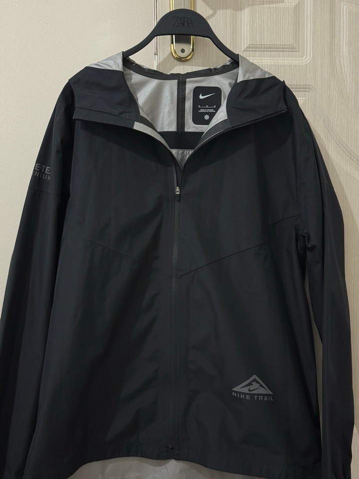 Nike marka siyah erkek rüzgarlık, çıtçıtlı yaka, uzun kollu ve bol kesimdir. Fermuarlı ön kapama ve sentetik kumaştan yapılmıştır, dış mekan için uygundur.