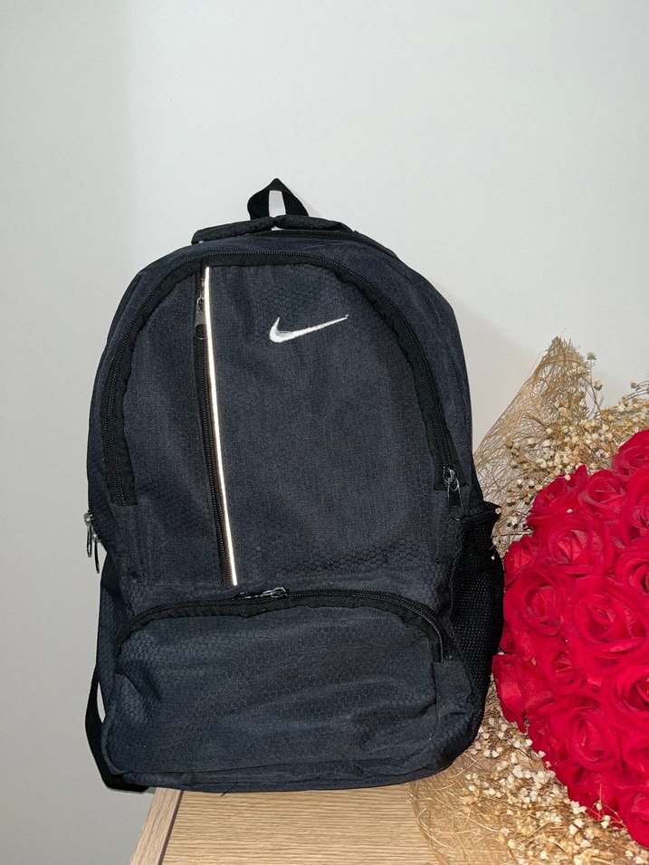 Nike marka siyah erkek sırt çantası, fermuarlı bölmeleri ve desen içermeyen şık tasarımıyla sokak modasına uygundur.