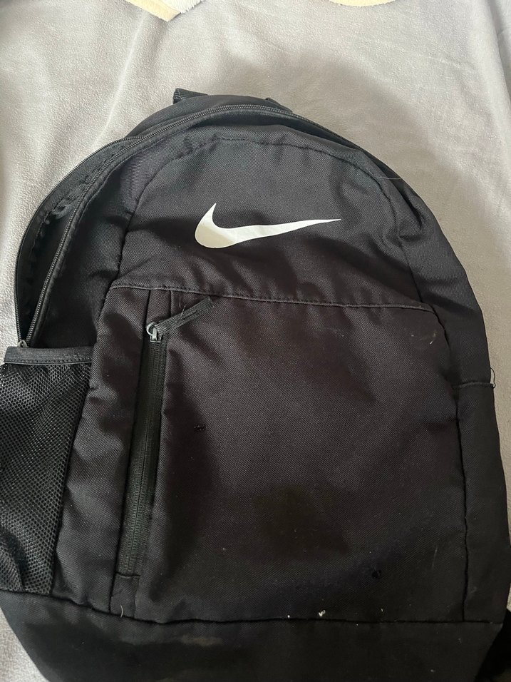 Nike marka siyah fermuarlı erkek sırt çantası, sade ve desensiz tasarımıyla sokak stili ve athleisure için uygun. Pratik depolama sağlar.