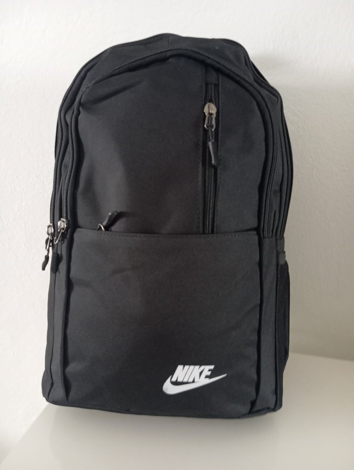 Nike markalı siyah, fermuarlı, desensiz erkek sırt çantası, street wear ve athleisure tarzlarına uygundur.