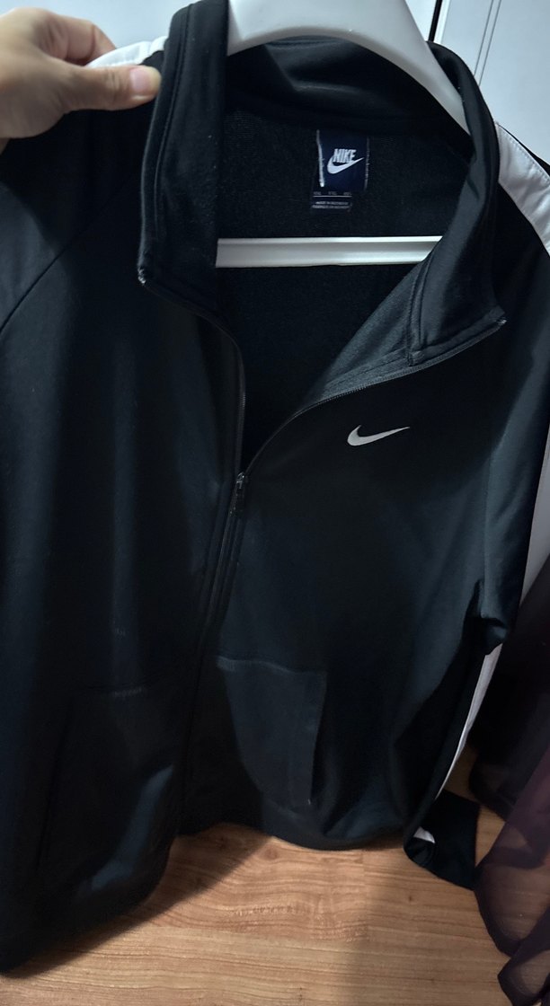 Nike markalı, fermuarlı, yüksek yakalı ve uzun kollu siyah erkek spor ceketi. Sentetik kumaştan, spor ve günlük kullanıma uygun.