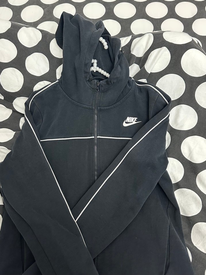 Nike markalı siyah erkek sweatshirt, fermuarlı ve yüksek yakalıdır. Yumuşak polar kumaştan üretilmiş, uzun kollu ve dar kesimdir. Günlük kullanıma uygundur.