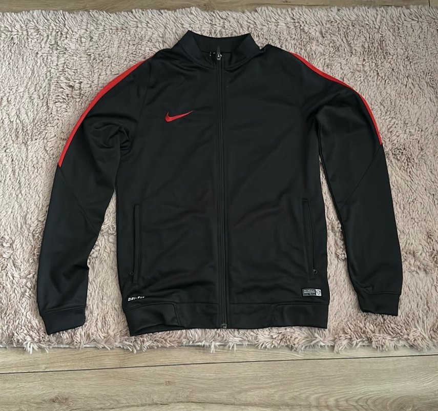 Nike siyah fermuarlı erkek üst, yüksek yakalı, kırmızı şerit detaylı ve uzun kolludur. Spor şıklığı sunar. en 52 boy 70