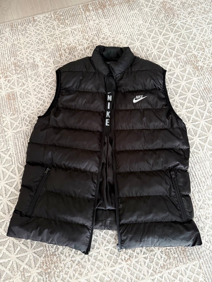 Nike marka siyah, fermuarlı, cep detaylı, yüksek yakalı, sentetik kumaştan erkek yelek. Günlük kullanıma uygun, fitted kesim. Sorunsuz.