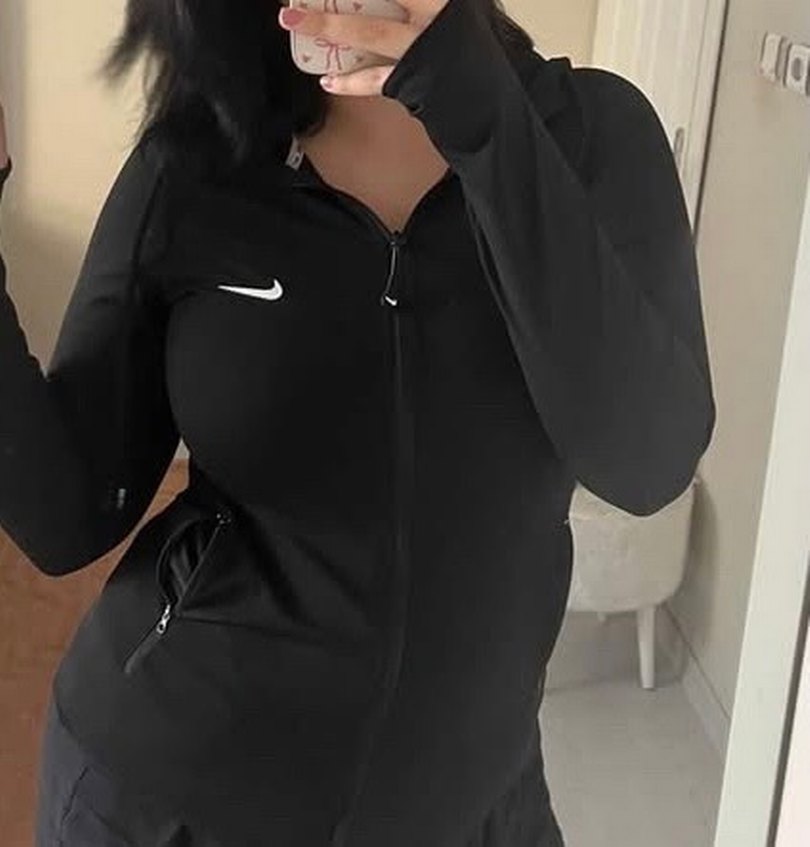 Nike markalı, yüksek yakalı ve uzun kollu siyah, fermuarlı kadın cekettir. Düz, şık ve günlük kullanım için uygundur.