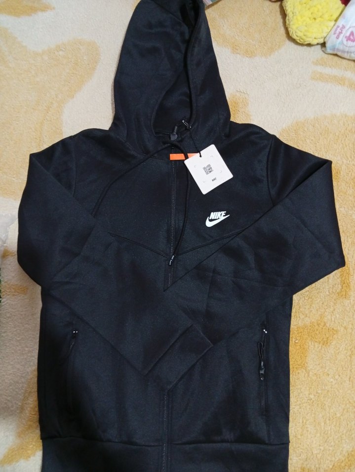 Nike marka siyah, fermuarlı ve kapüşonlu uzun kollu sweatshirt. Yumuşak ve rahat kumaştan, günlük kullanım için uygun.