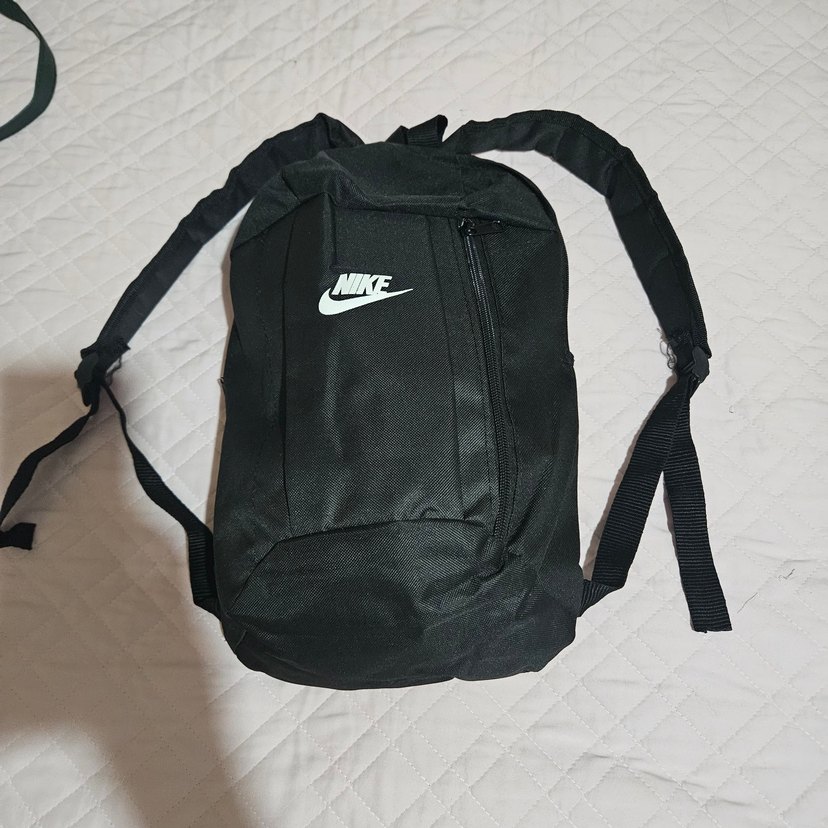 Nike'nin siyah, fermuarlı ön cep ve baskılı logolu sırt çantası, sade ve temel sokak stili için uygundur.