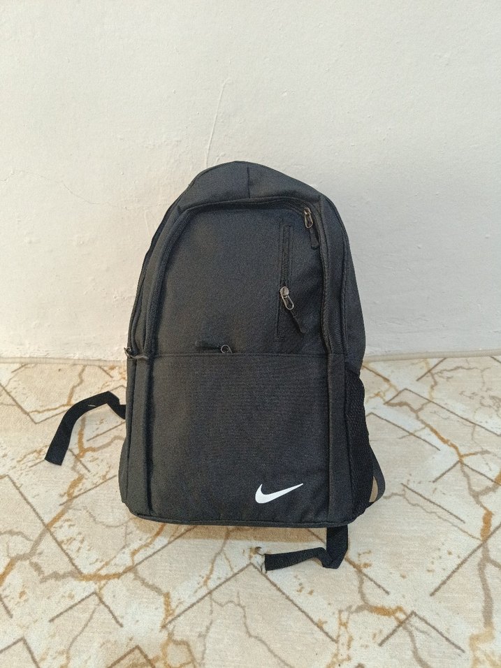 Nike markalı siyah sırt çantası, fermuarlı cepleri ve dayanıklı sentetik kumaşıyla spor ve sokak stiline uygundur. ♀️
