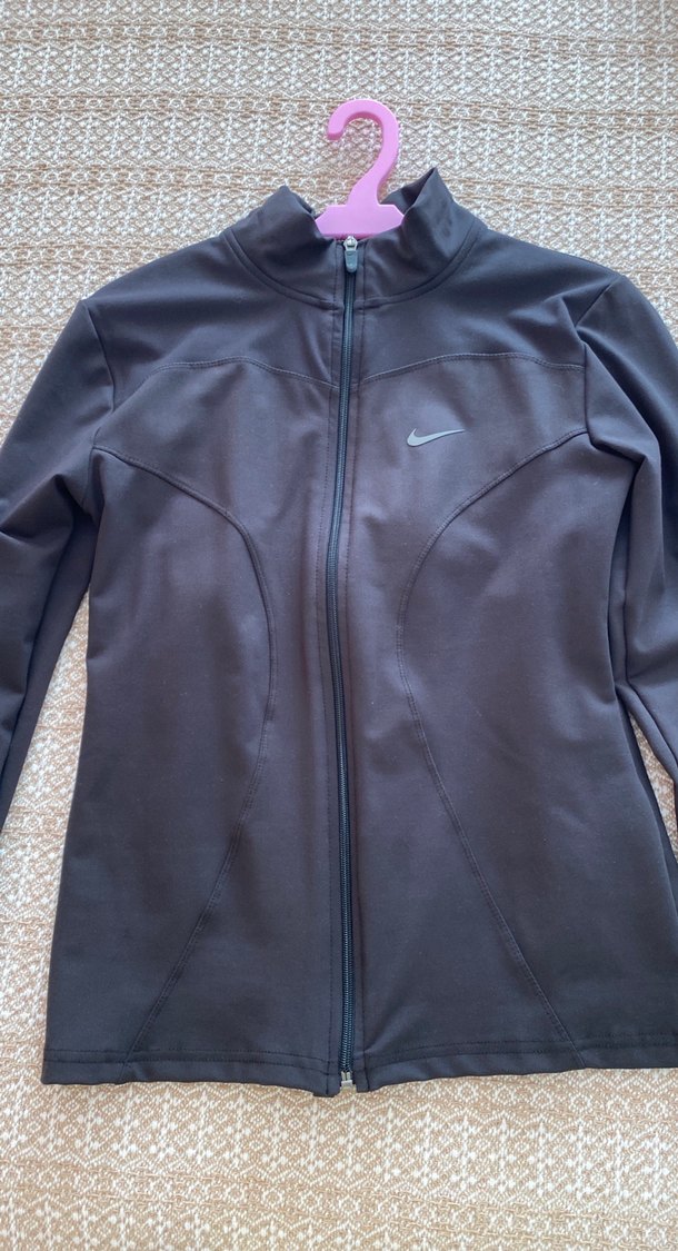 Nike siyah spor ceket, fermuarlı ve yüksek yakalıdır. Uzun kollu, vücuda oturan kesimi ve normal midi boyu ile rahat kullanım sunar.